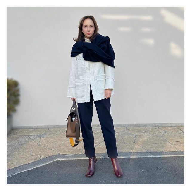 ぴったりした「レギンス・スキニーパンツ」をブーツインするのも◎。パンツとブーツを黒色で揃えれば、下半身が繋がり脚長見えします。このとき、ブーツから見えないような短い靴下を合わせておくのをお忘れなく。