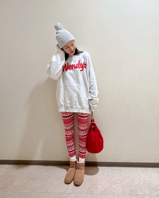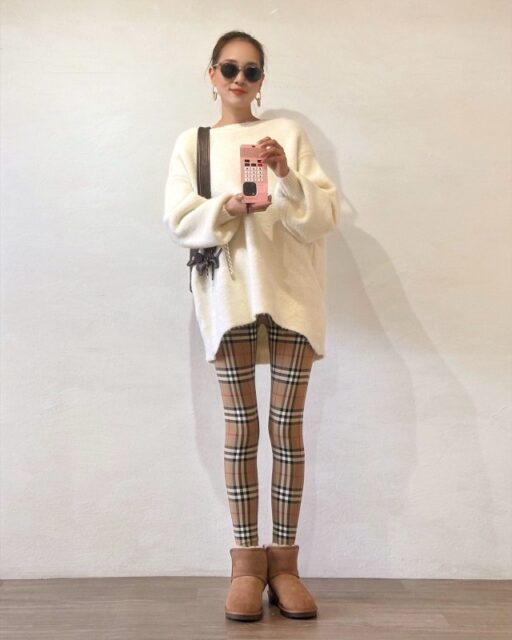 遊び心たっぷりなコーデに仕上がるのが「総柄レギンス」とショートブーツの組み合わせ。中でもムートンブーツとの合わせはカジュアル感が高まり、大人可愛いルックスに。ご近所コーデはもちろん、ヨガやピラティスに行くときにもおすすめです。