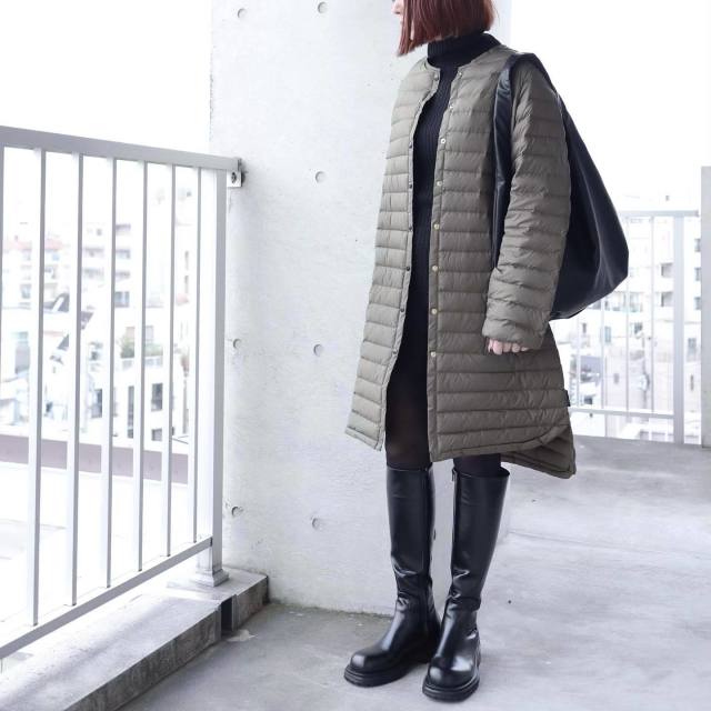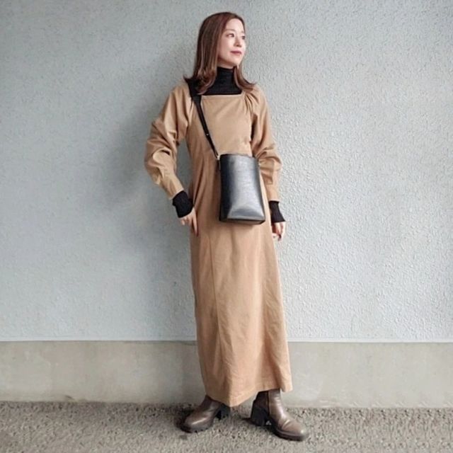 黒タートルネックを「首元が広いワンピース」の下に着るのも◎。首まわりをしっかりカバーしながら、クラシカルな雰囲気に決まります。例えば真冬に着こなしにくいスクエアネックのワンピースも、黒タートルネックを合わせればシーズンムードが高まり、大人っぽいお出かけコーデに。