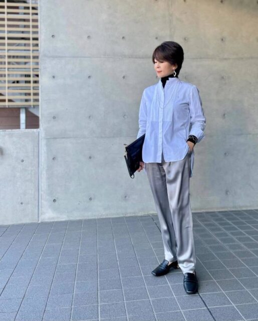 意外性があるのが「白シャツ」との組み合わせです。ゆったりとした白シャツに黒タートルネックをインするだけでコーデの鮮度がアップ。冬は出番が少なくなる白シャツを活用できる上に、クリーンな重ね着ファッションが楽しめます。