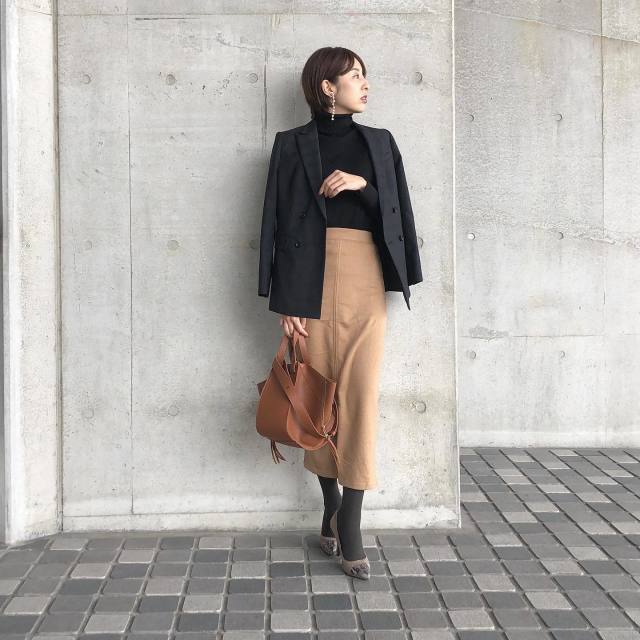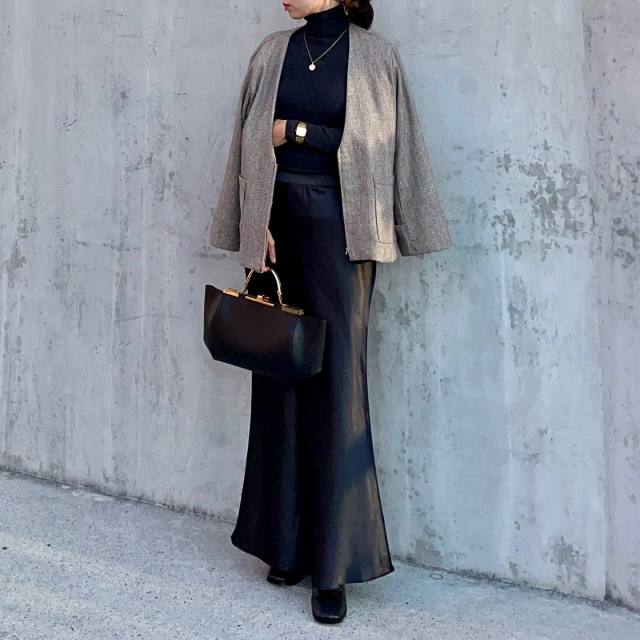 黒タートルネックはシンプルだからこそ「映えスカート」を着るときにうってつけ。お目立ちな色柄やデザインのスカートを引き立てて、シックなコーデにまとめます。
