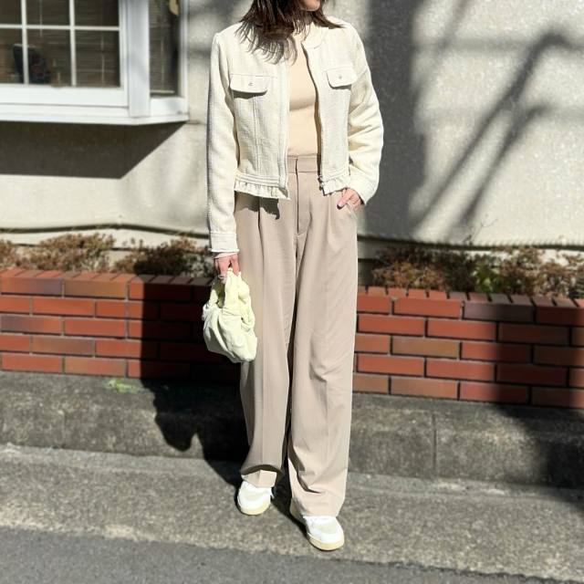 こちらは、白ツイードジャケットとベージュワイドパンツで作ったスタイル。足元はスニーカーで親しみやすくまとめていますが、ツイード素材やふんわりカラーを散りばめることで上品さもキープしています。きれいめ派さんにもおすすめしたい、3月にぴったりな普段着コーデです。