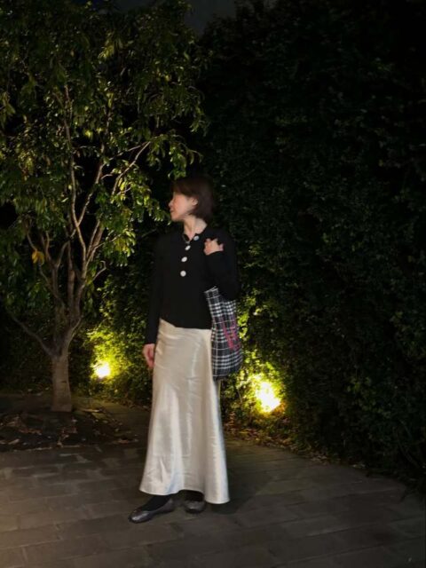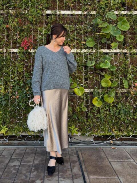 50代のお出かけコーデにぴったりなのが「ベージュのサテンスカート」。光沢とドレープ性のあるサテンスカートはドレッシーすぎる?と思いきや、ベージュ色なので普段使い感がグンとアップ。下半身の着痩せ見えを促しながら、大人っぽいスタイリングに決まりますよ。
