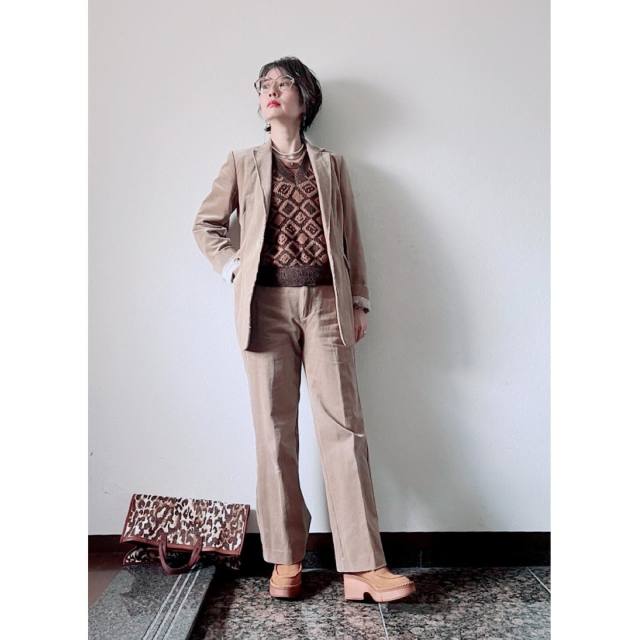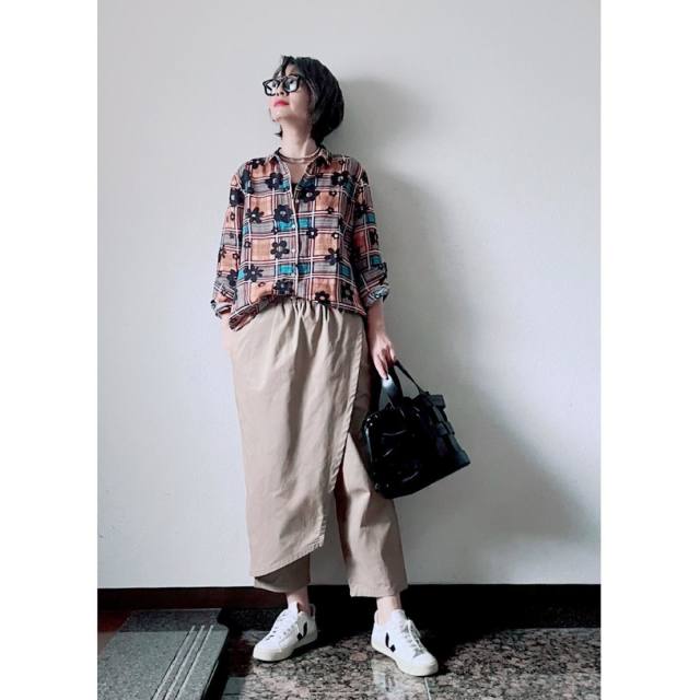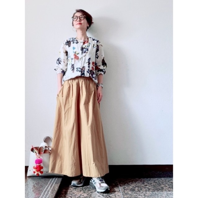 「柄トップス」に最適なのがベージュ色のゆるっとしたパンツ。ともすれば派手見えしがちなトップスも、ボトムにクセのないベージュ色を合わせることでコーデが落ち着きます。