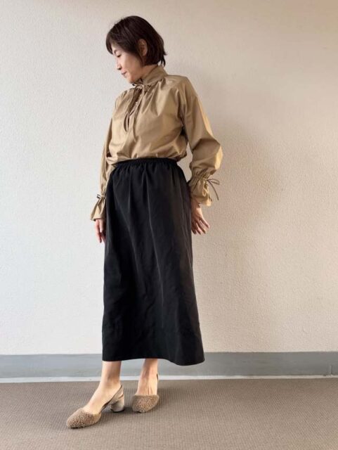 ベージュ色の本領が発揮されるのが、フェミニンな服で取り入れるとき。例えば装飾性のあるブラウスも、ベージュなら悪目立ちせず50代の装いにしっくり馴染みます。ベーシックな黒スカートに合わせるだけで、きちんとしたコーデが完成。