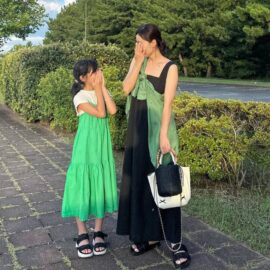 まずご紹介するのは、ベージュワンピースにブラックカーディガンを重ねたコーデ。ぼやっと間延びしがちなベージュワンピースですが、黒で引き締めると大人っぽいメリハリが生まれます。小物も黒で統一すれば、着こなし全体のまとまり感もアップ!