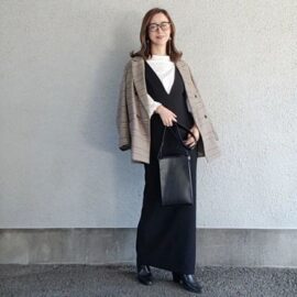 地味色のスタイリングだからこそ、むしろアクセサリーは盛り盛りぐらいがちょうどいいバランス! スナップでは大ぶりのネックレスとピアスをダブル使いすることでエッジを効かせています。アクセサリーを2カ所取り入れる場合は、一方を小さめサイズにするとバランスがよくなります。