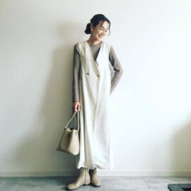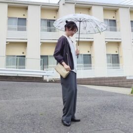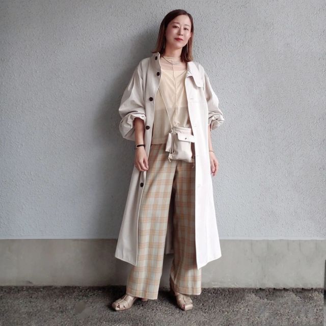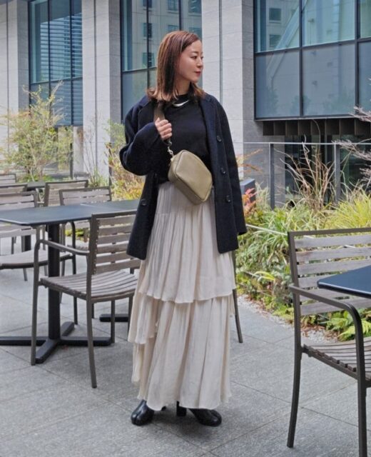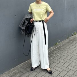 「同系色のボトム×ショルダーバッグ」の組み合わせも◎。腰付近にあるバッグがボトムに馴染むことで、コーデがスッキリ見えします。