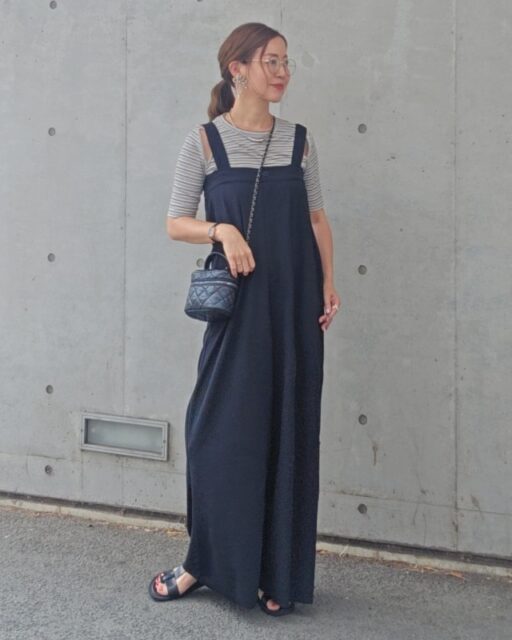 ゆるっとしたサロペットパンツやオールインワンはラクな一方で、子どもっぽく見えることも。そこでおすすめなのが「チェーンストラップのショルダーバッグ」です。