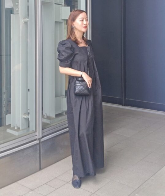 淡い色でゆるっとしたシルエットのワンピースは、ともするとルーズに見えがちに。そんなときには「黒のショルダーバッグ」が役立ちます。