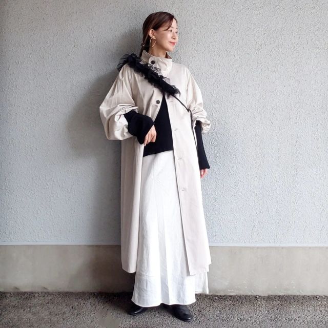 アウターを羽織る場合、ショルダーバッグはアウターの中に入れるのがおすすめ。こうすることでコートやジャケットのシルエットが崩れず、コーデがスッキリまとまります。このとき斜め掛けしたバッグがチラリと見えるようアウターの前を開けておくと、スタイリングに奥行きが生まれ立体感のある着こなしに。