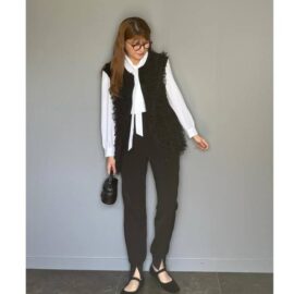 最後にご紹介するのは、ブラックのUNIQLO(ユニクロ)スウェットパンツにガーリーなフリルブラウスを合わせたコーデ。このようにカジュアルな着こなしに甘さを追加すると、お互いが引き立てあっておしゃれ度がアップしますよ。大人だからこそ楽しめるミックスコーデです♪