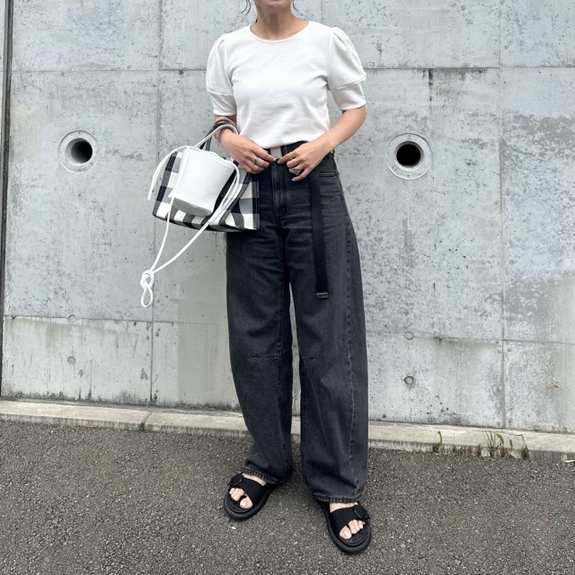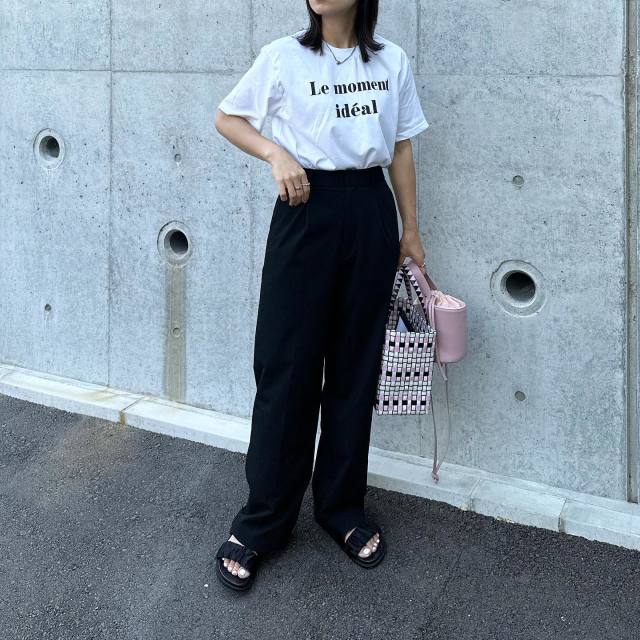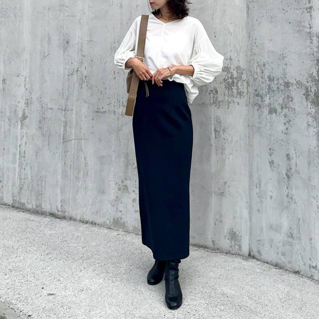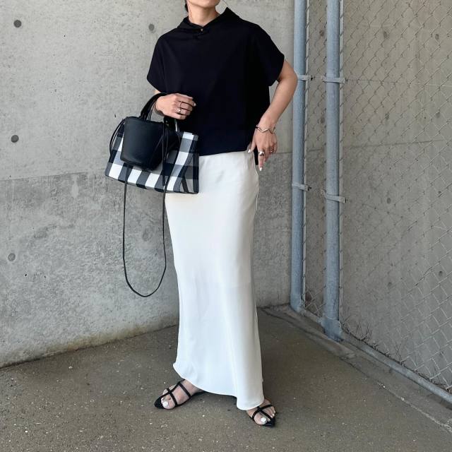 引き締まった印象がさらにアップするのが黒バッグとの合わせ。モノトーンコーデのシャープさをよりいっそう高め、辛口な雰囲気をプラスします。