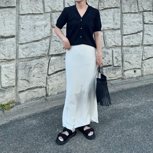 特に夏におすすめなのは、カゴバッグなど天然素材で取り入れること。上品で穏やかでありながら涼しげなモノトーンコーデに仕上がりますよ。