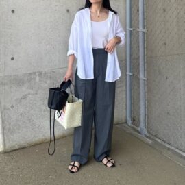 ウエストアウトでラフに白Tシャツを着たいときは、少し主張のあるパンツとの合わせがGOOD! ストライプのイージーワイドパンツなら爽やかなコーデにまとまります。バッグやシューズはホワイトレザーを選んで上品さもプラスしましょう。