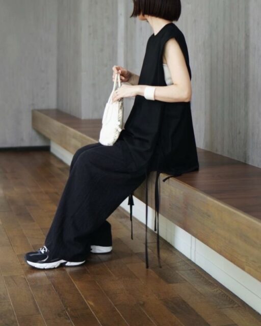 特におすすめなのがダークカラーコーデとの合わせ。明るいカラーのトートバッグがアクセントとなり、装いに軽やかさをプラスします。