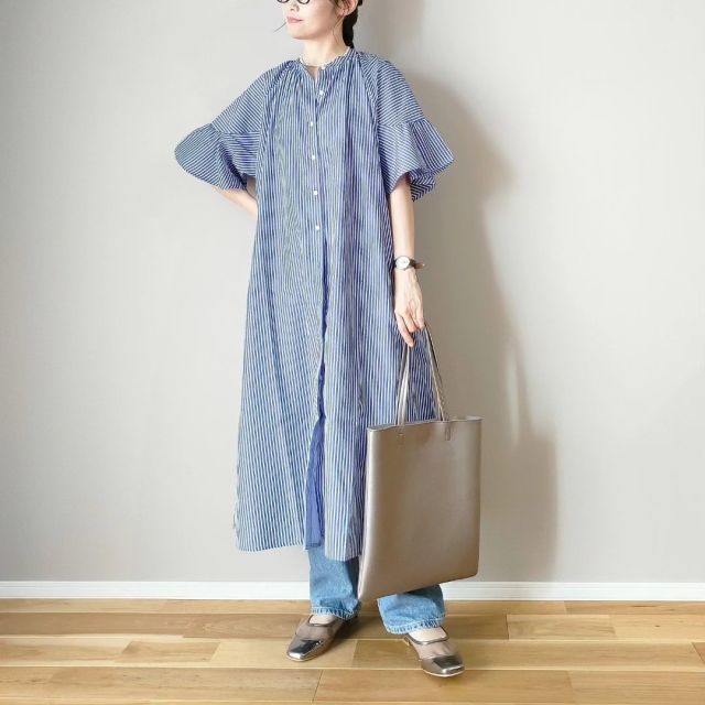 シンプルコーデの差し色におすすめなのが「シルバーのトートバッグ」。シャイニーなシルバーのバッグは合わせやすく、アクセサリー感覚で使えるのがメリットです。