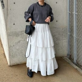 「ショート丈のプルオーバー・ニット」はカーゴパンツと相性バツグン。丈感が短いので裾を入れ込む必要がなく、テクニック不要でおしゃれなコーデが完成します。さらにバランスアップすることで、ゆるっとしたパンツを女性らしく着こなせますよ。