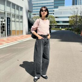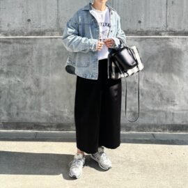 トップスのおすすめは「コンパクトなTシャツ」。ボディラインに沿ったTシャツがゆるっとしたパンツを引きめ、大人カジュアルな装いを演出。Tシャツの裾をインして着こなすと、コーデがきれいめにまとまりますよ。