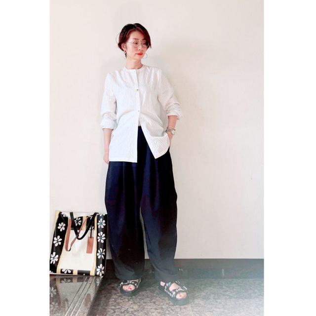 【50代の白シャツコーデ3】ワイドパンツに映えデザインの白シャツを合わせる