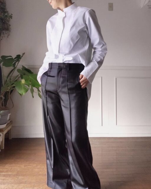 気分がシャキッと引き締まるような端正な白シャツ。カッチリとしたスタンドカラーやヨーク切り替え、ピンタック仕様のデザインにはドレスシャツ感があり、着るだけでコーデがきちんと見えします。メンズライクなパンツにシャツインして、ハンサムに仕上げると◎です。
