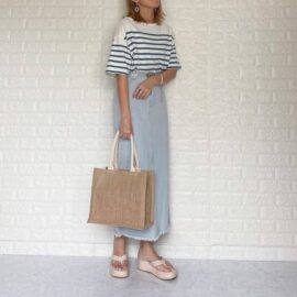こちらは、ブルーニットとブラウスのレイヤードコーデにLOEWE(ロエベ)のかごバッグをプラス。天然素材同様に爽やかさを感じるブルーアイテムは、かごバッグと合わせやすく相性バツグン!