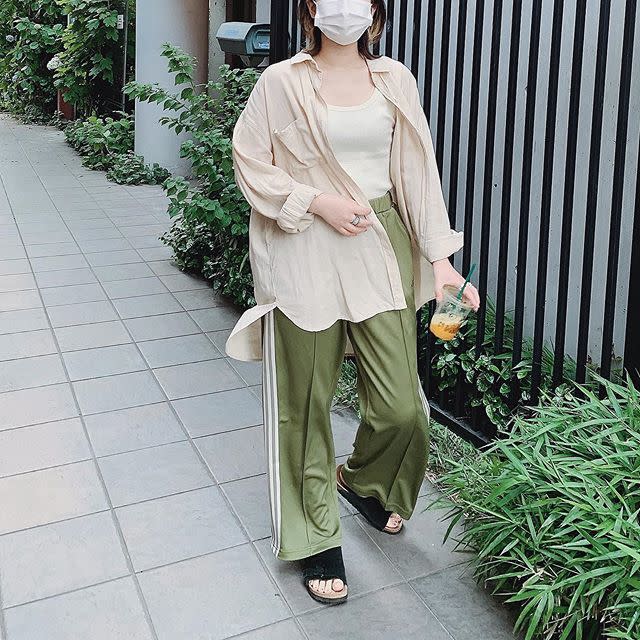 「ジャージパンツ」は伸縮性がありスポッチャにぴったりハマる一方で、ともすれば部屋着っぽく見えてしまいがち。そんなときにおすすめなのが透け感のあるトップスです。シアーシャツやシアーブラウスを合わせるだけで印象がガラリとチェンジ。ジャージパンツが街着っぽく仕上がり、かつ今どきのコーデに決まりますよ。