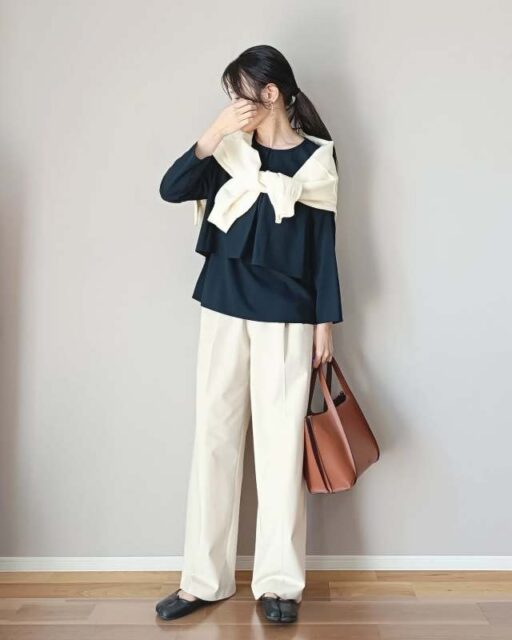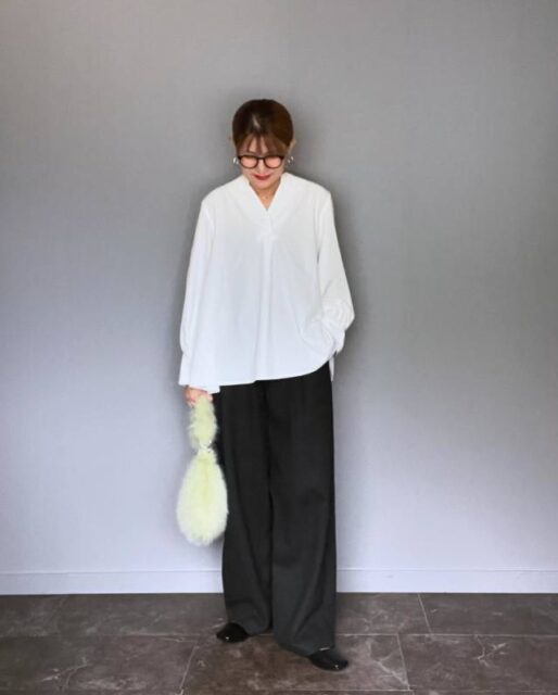 ゆったりとしたブラウスにパンツを合わせる場合は、服の色にメリハリを付けましょう。上下にコントラストが生まれスッキリと決まります。強い色対比が効くため、インしない着こなしがダラしなく見えません。