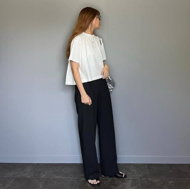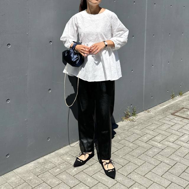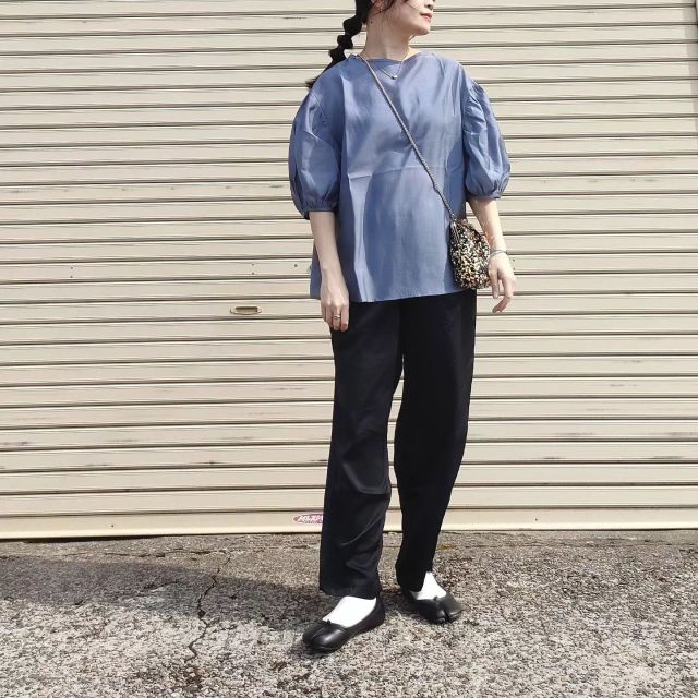 インしないブラウス×パンツコーデで、スタイルアップ見えが叶うのが「ショート丈のブラウス」。コンパクトなブラウスはインする必要がない上に、パンツの布面積が長くなることで脚長効果まで期待できます。