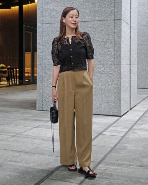 トレンドの「レース・ジャガード生地のブラウス」はパンツの裾出しファッションにうってつけ。異素材感のあるブラウスが視線を集め、インしなくてもコーデが着映えます。
