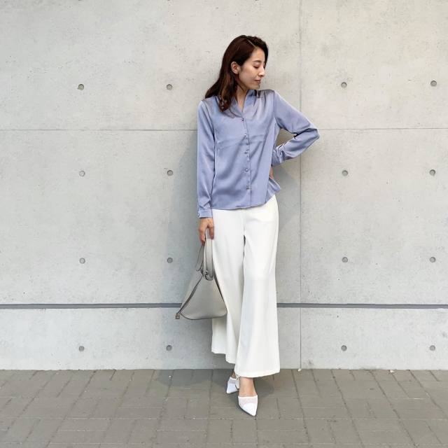 まずブラウスをインしないで着るときはパンツ選びが肝心。おすすめなのが「ワイドパンツ」です。ゆったりとしたシルエットであれば、テーパードパンツやスラックスをはじめ、イージーパンツやコクーンパンツなどどんなデザインでもOKです。