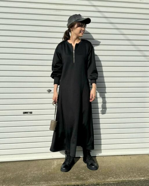 明らかにカジュアルな黒ワンピースもおすすめ。例えばスポーティなハーフジップデザインや、ゆるっとしたシャツワンピースは軽やかな雰囲気が持ち味。喪服のイメージがなくタウンユースにマッチします。ゴツめのブーツやスニーカーを履くとなおヨシです。