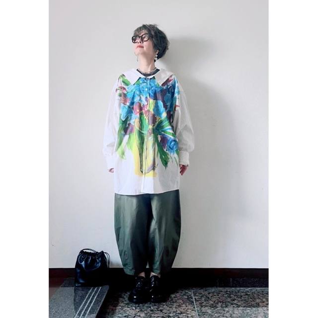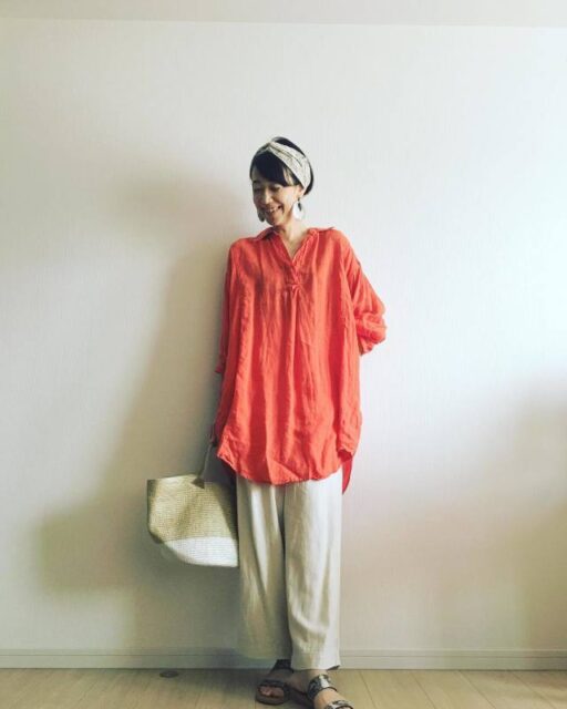 大胆な花柄やビッグカラーなど映えデザインのチュニックは50代にぴったり。流行りの柄やデザインのおかげでコーデがおしゃれ見えします。ゆったりとしたパンツを合わせれば今どきのルックスに決まりますよ。