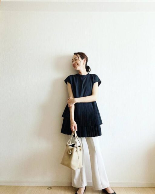 女性らしく着こなしたいときは「ペプラムチュニック」がお役立ち。裾広がりのペプラムが効いてメリハリがアップ。加えてコーデを白と黒でまとめると全身がスッキリ仕上がります。