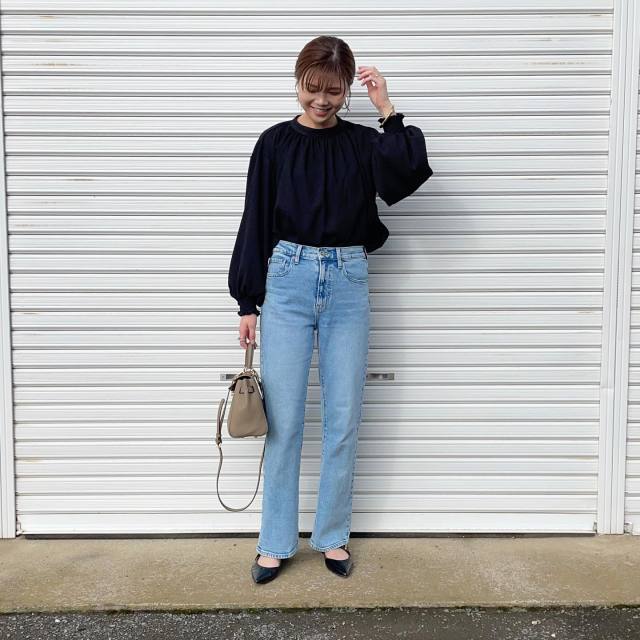 甘い黒ブラウスには「デニムパンツ」を合わせましょう。カジュアルなパンツとシックな黒色の掛け合わせにより、フリルやギャザーのブラウスが落ち着いた雰囲気に。普段使い感のあるデニムのおかげで親しみやすさもアップして、自然体のコーデに決まりますよ。