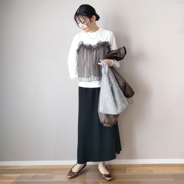 黒のスカートには「甘めトップス」を投入。ビスチェの重ね着やチュールが入ったトップスを選ぶとフェミニンなムードがグッとアップ。黒マーメードスカートやタイトスカートを可愛らしく着こなせますよ。