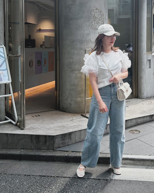スナップでは、チュールフリルがおしゃれなトップスをデニムパンツでカジュアルダウン。まさに大人可愛いスタイリングに。
