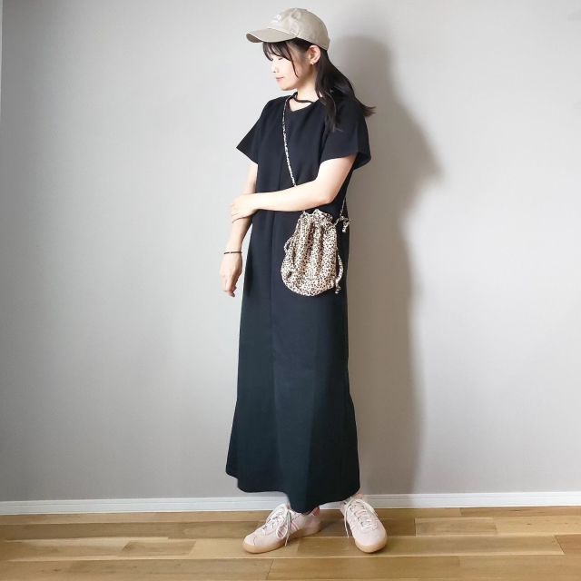 「全身ダークカラーで着こなしが重く見える」、そんなときはベージュスニーカーを合わせると、足元に程よい軽さをプラスできます。スナップのようなオールブラックコーデも、スニーカーや小物をベージュにするだけでバランスアップ!
