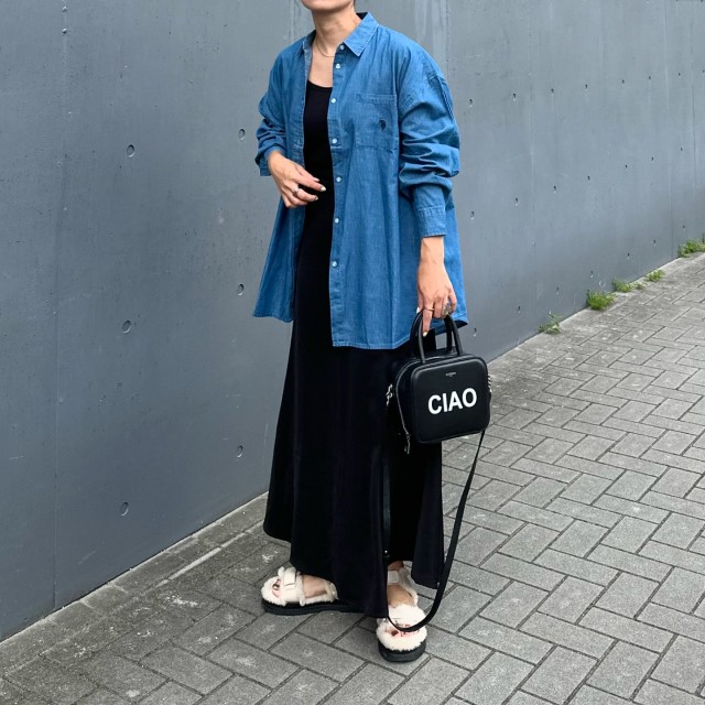 次にご紹介するのは、デニムシャツ×マーメイドスカートの組み合わせ。レディでフェミニンな印象のマーメイドスカートをあえてカジュアルに着こなすと、今っぽい雰囲気にブラッシュアップ。一方でスカートが上品だからこそ、カジュアル服も大人っぽくまとまりますよ。