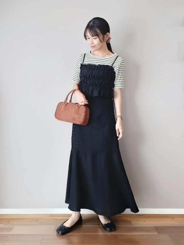 まずご紹介するのは、フリルキャミソールのレイヤードトップスにマーメイドスカートを合わせたスタイリング。上半身にアクセントをつけることで、マーメイドスカートの存在感は控えめに。でも、その美シルエットのおかげでコーデ全体が上品に決まります。