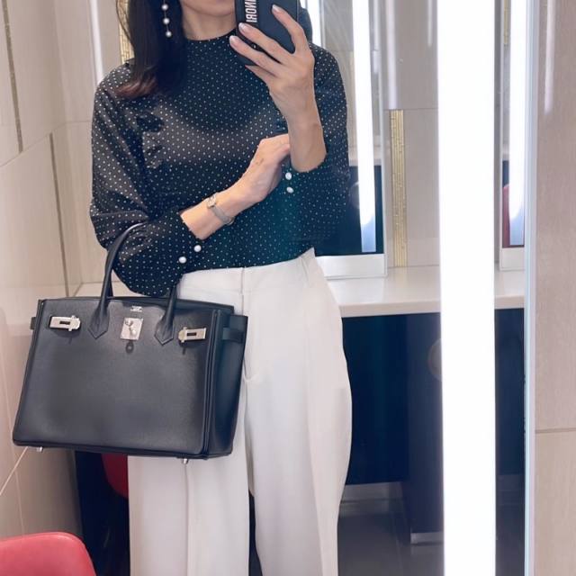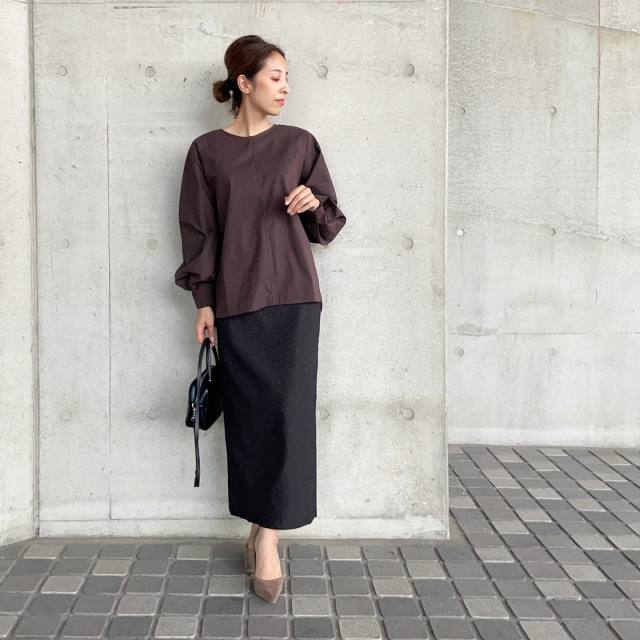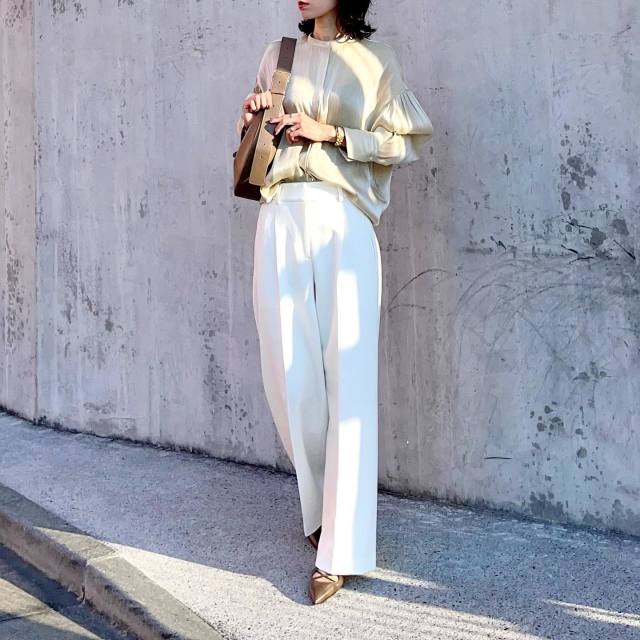 出張にイチ押しのトップスは「シワになりにくいブラウス」。ツルツルとしたポリエステルやレーヨン生地を選ぶと、バッグの中に収納してもシワがつきにくく安心です。サッと着るだけで上品なルックスに決まります。