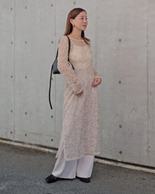 レイヤードコーデが注目されている今秋はシアーワンピースを持っていると便利。ベーシックなワンツーコーデも、シアーワンピースを重ねるだけで一気に華やかなスタイルにシフト。パンツと重ね着するバランスも今の気分にぴったりです。