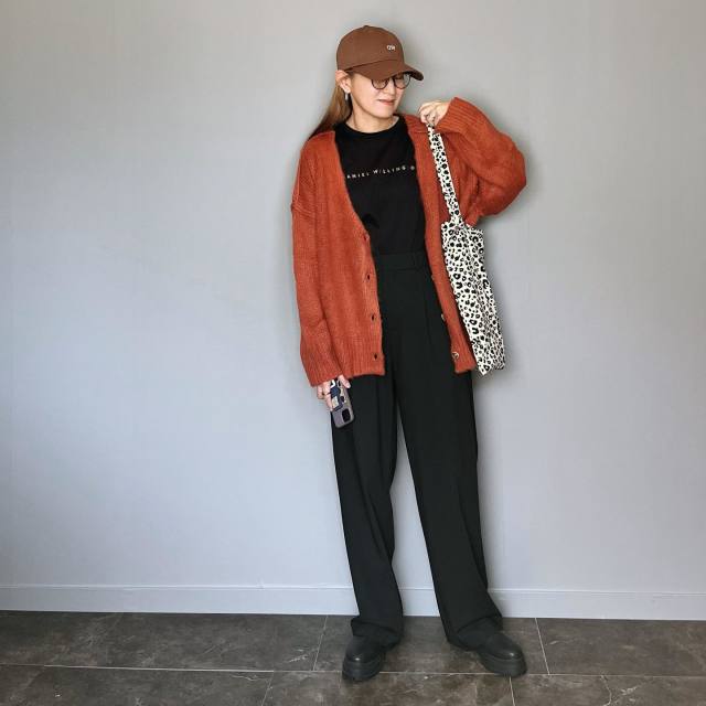 暖色系の茶色キャップは秋冬らしい赤やオレンジと相性バツグン。特に今年は赤系カラーがトレンドになりそうとあり、おしゃれなスタイリングが楽しめますよ。色味が強めなので、シンプルコーデもスタイリッシュにまとまります。