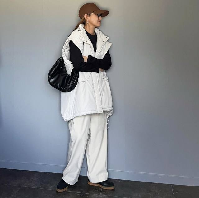 まずご紹介するのは、白黒でまとめた秋冬のモノトーンコーデ。クールな配色には、茶色キャップで温感をプラスするのがイチ押しです。温かみを感じる茶色を顔まわりに合わせることで、秋冬らしさがより感じられますよ。