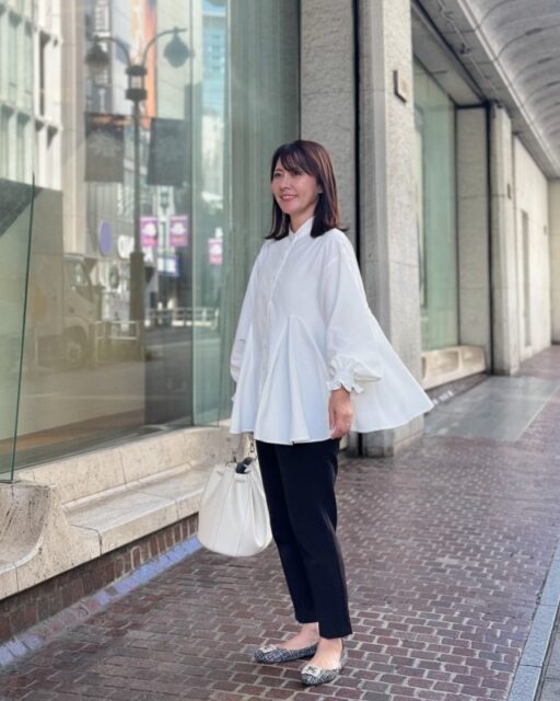 オフィスカジュアルの職場なら「映えデザインの白シャツ」を選んでみては。例えばケープデザイン・ボリューム袖・ペプラムなど可愛らしいデザインでも、白色のシャツブラウスであれば問題ありません。ベーシックな黒パンツを合わせると全体が引き締まり、通勤コーデに馴染みます。