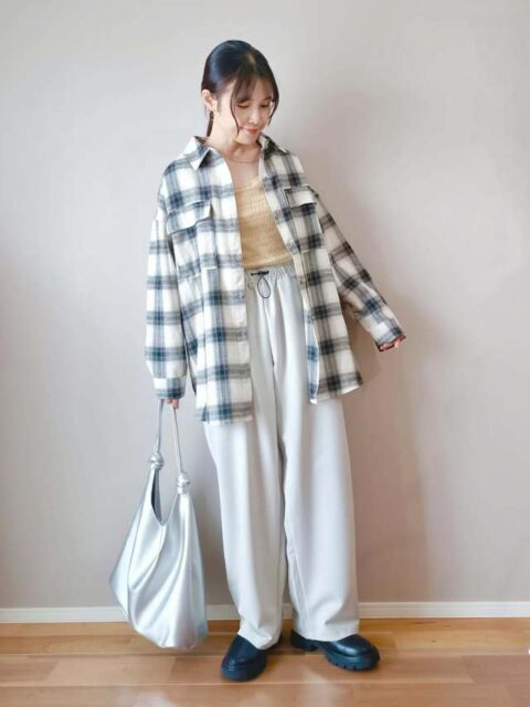 程よく気温調節したいときはシャツをアウター代わりに使うのがおすすめ。オーバーサイズシルエットを選んでおくと、腰まわりまですっぽりカバーできます。薄手素材かつ丈感が長すぎないためコンパクトに畳め、荷物になりにくいのもメリット。
