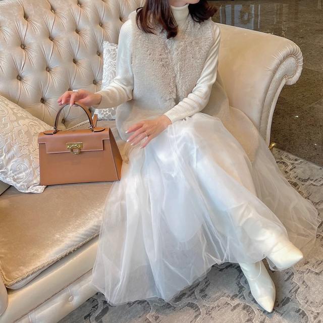 もこもこ感が可愛いボア素材やふわふわなファーとの組み合わせも◎。スナップのような真っ白コーデも、あったかアイテムや足元のブーツで冬らしさを取り入れると、透け感あるチュール素材とのコントラストが楽しめますよ。