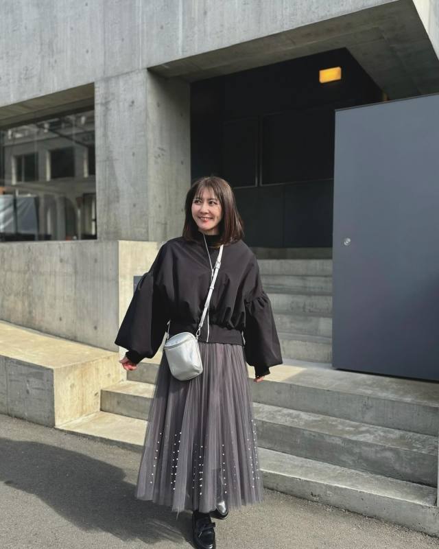 チュールスカートの軽やかさを生かして冬アウターに合わせると、足元に程よい抜け感が生まれます。冬のアウターコーデはずっしり重く見えがちですが、シアーな透け感をプラスすることでバランスアップ!