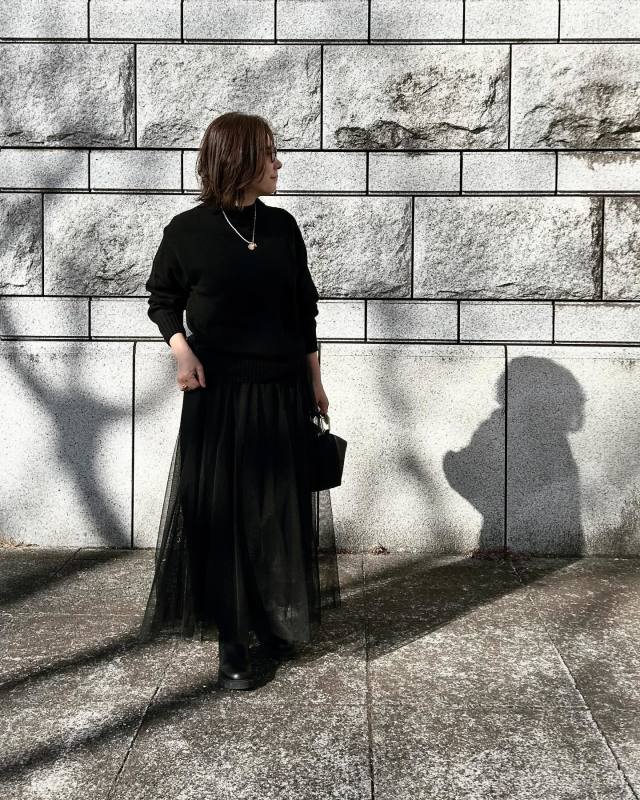 例えばスナップは、冬に多くなる黒やグレーなどの濃色スタイル。ここにチュールスカートを取り入れると、程よい軽さが加わって全体のバランスが整います。ちょっとクールなブラックコーデに女性らしさをプラスできる利点もアリ。