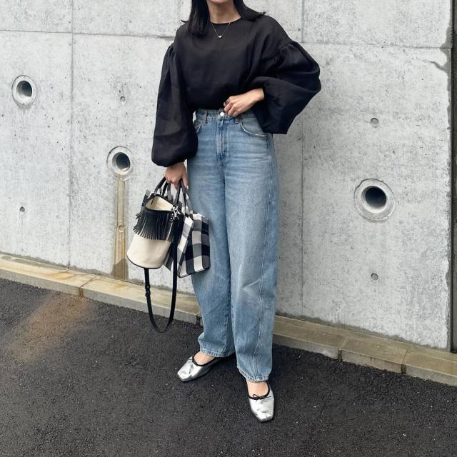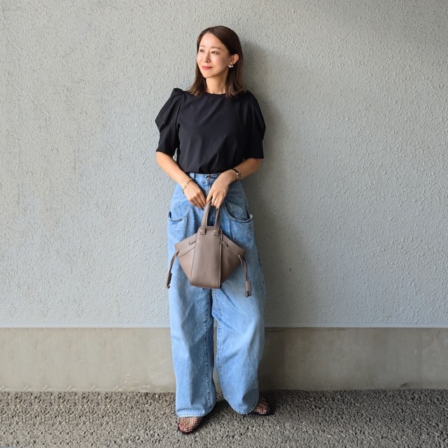 カジュアル派さんにおすすめなのが「デニムパンツ」との着合わせ。流行りのワイドデニムを選ぶとコーデの鮮度がアップ。また黒ブラウスを合わせることで、普段使い感のあるデニムを大人っぽく着こなせます。